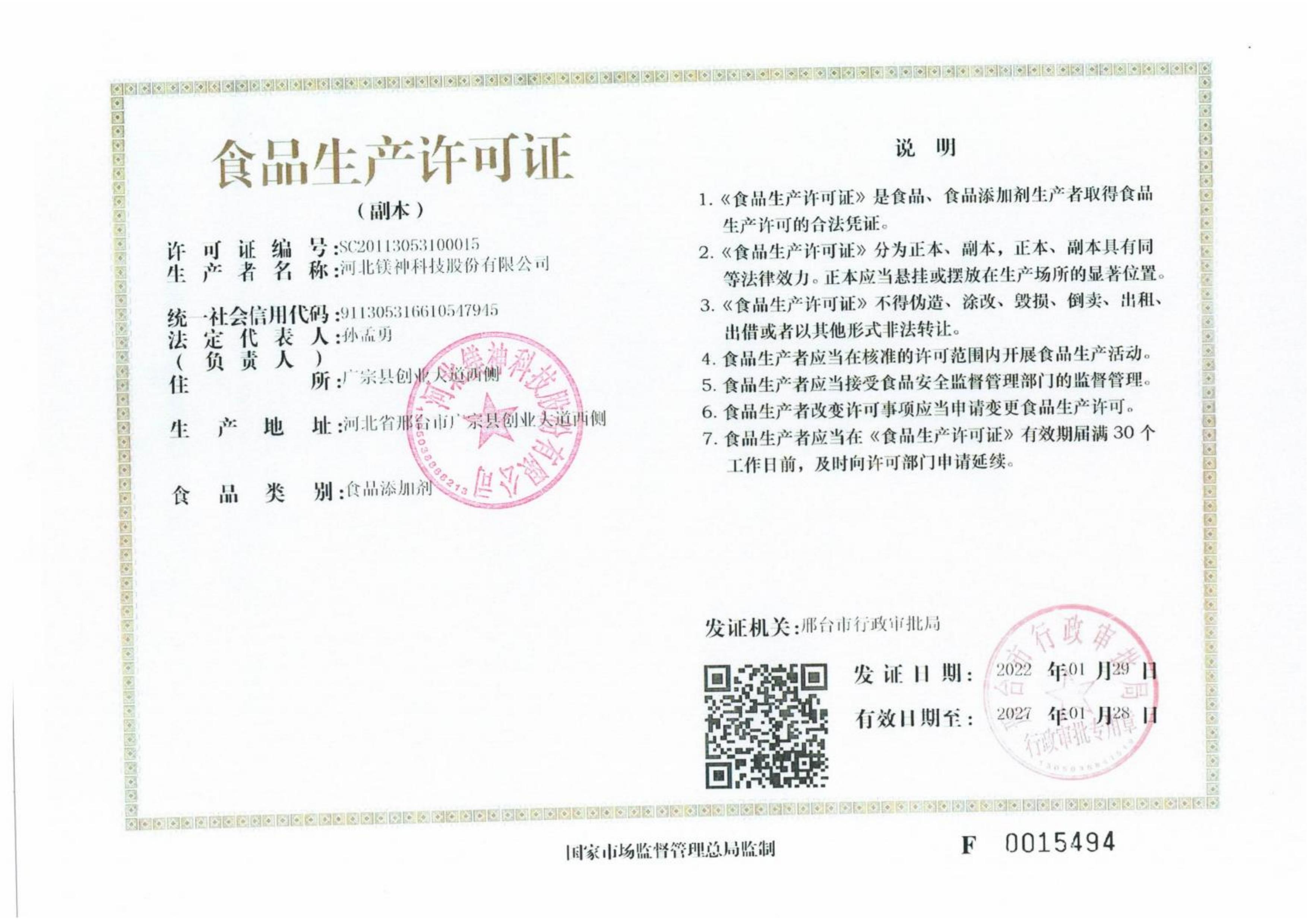 冶金鎂業(yè)食品生產(chǎn)許可證副本