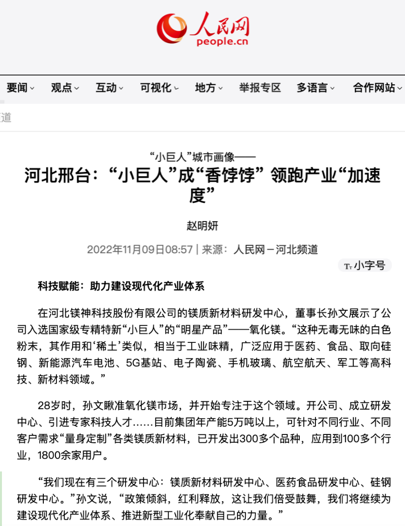 人民網(wǎng)報(bào)道!“小巨人”鎂神