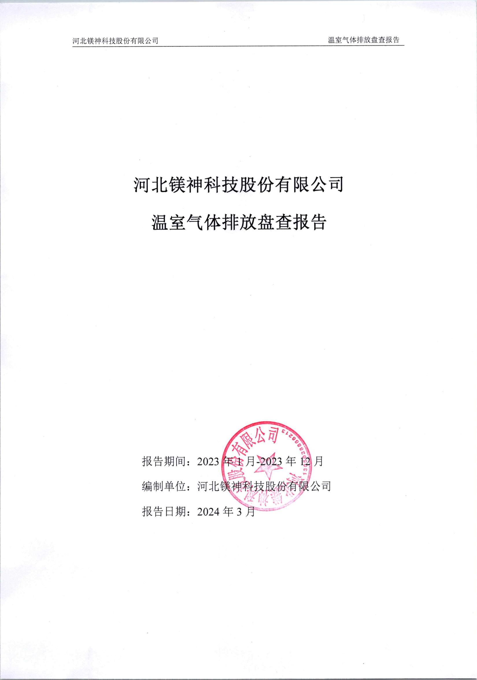 河北鎂神科技股份有限公司2023年度溫室氣體排放盤查報(bào)告