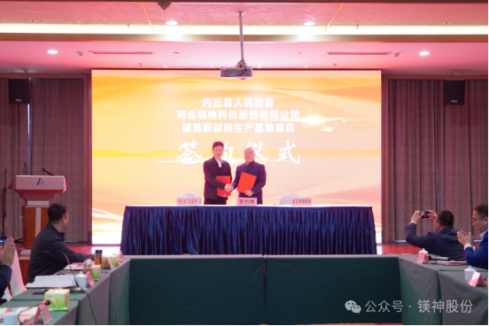 2025年3月28日,河北鎂神科技股份有限公司與內丘縣人民政府在阿爾卡迪亞酒店悅盛廳隆重舉行鎂質新材料生產基地項目簽約儀式。該項目總投資20.25億元,選址邢臺市內丘縣工業園區,致力打造世界級高端鎂質新材料生產基地,為區域經濟高質量發展注入新動能。