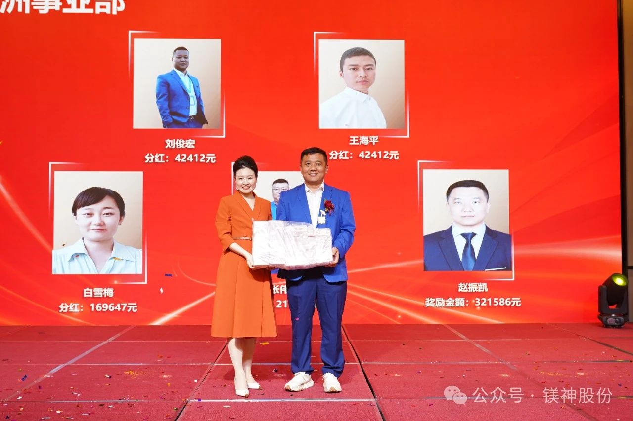 3月31日,河北鎂神科技股份有限公司2024年度總結暨表彰大會在邢臺市瑞爵酒店舉行,本次共發放獎金1227.88萬元!其中第四季度提成138.34萬元、銅級榮休紀念獎0.67萬元、私欠清零4.3萬元、評優評模76.8萬元、特殊貢獻獎18萬元、優秀團隊11萬元、專項獎金179.64萬元、職能中心年終獎72.84萬元、利潤中心分紅698.3萬元、扎根非洲、熱愛非洲、建設非洲獎28萬。