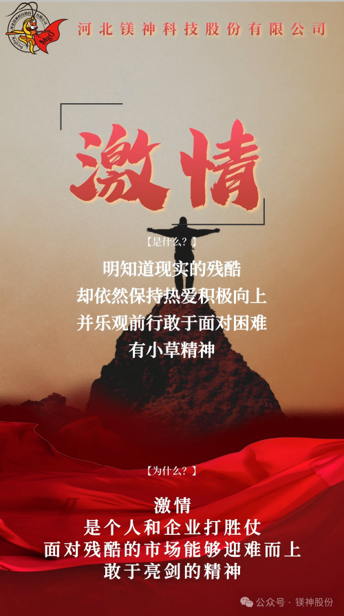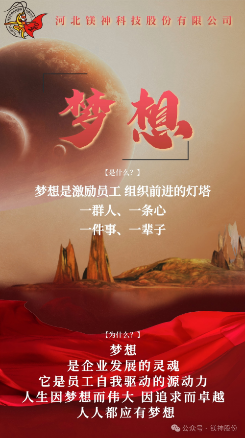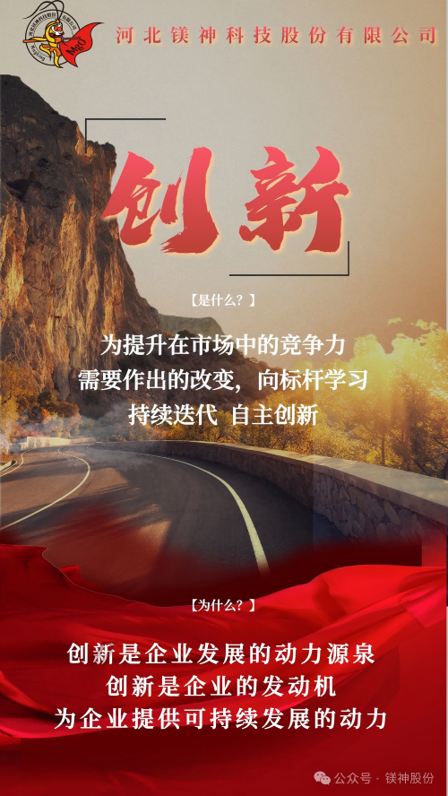 從太行山麓到走向世界舞臺的鎂質新材料領航者,鎂神科技以文化力量開啟新征程。近期,經(jīng)過全體鎂神人的共創(chuàng),承載著鎂神人精神基因的企業(yè)文化2.0升級版正式發(fā)布,同時公眾號將會開展“鎂神人企業(yè)文化故事”發(fā)布活動,它是指引鎂神人行動的燈塔,是我們凝聚團隊力量,激發(fā)創(chuàng)新活力,助力企業(yè)騰飛的重要舉措;是我們傳承精神基因,引領行業(yè)潮流,邁向世界舞臺的內(nèi)生動力,是我們對“創(chuàng)建百年鎂神平臺”的堅定信念與承諾。