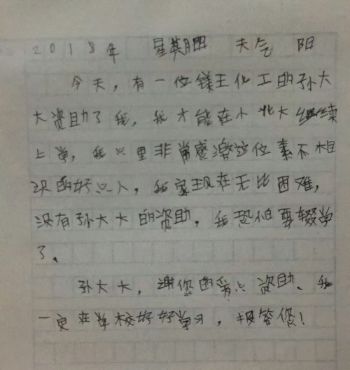 當年8月份,紀某某和賈某某兩位學生分別以優異的成績考入石家莊鐵道學院和河北工程技術學院。因家庭收入過低,無法支付昂貴的學費,家人一籌莫展,得知情況后,孫文董事長慷慨解囊,分別給予紀某某10000元、賈某某6000元的資助。受助家長激動地說,真不知道怎么感謝董事長的恩情,兩位學生表示,一定不辜負孫文董事長的愛心和厚望,努力學習,用優異的成績回報社會。